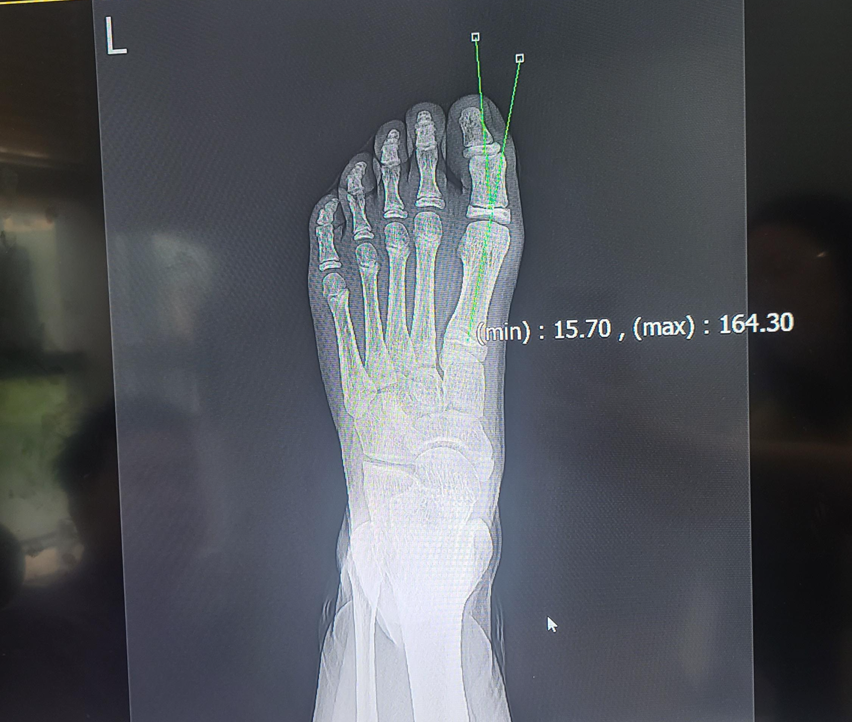 발을 위에서 찍는 X-ray를 통해 엄지발가락과 발의 각도(보통 15도 이상이면 무지외반증 진단), 관절 상태, 뼈의 변형 정도를 정확히 파악할 수 있습니다.