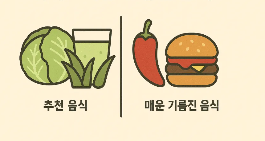 양배추, 감자, 두부, 바나나, 미음이 좋습니다. 위를 자극하지 않고 점막 회복을 돕습니다.