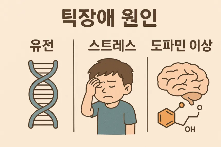 A. 틱장애 원인은 도파민 불균형, 유전, 스트레스, 감염 등 여러 요인이 복합적으로 작용합니다.