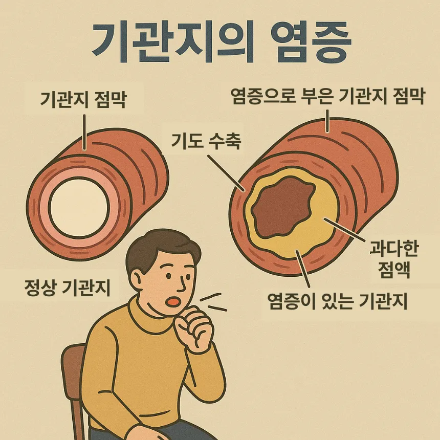 감기에서 시작된 증상이 기관지까지 번지며 염증을 유발하게 됩니다. - 세균 감염